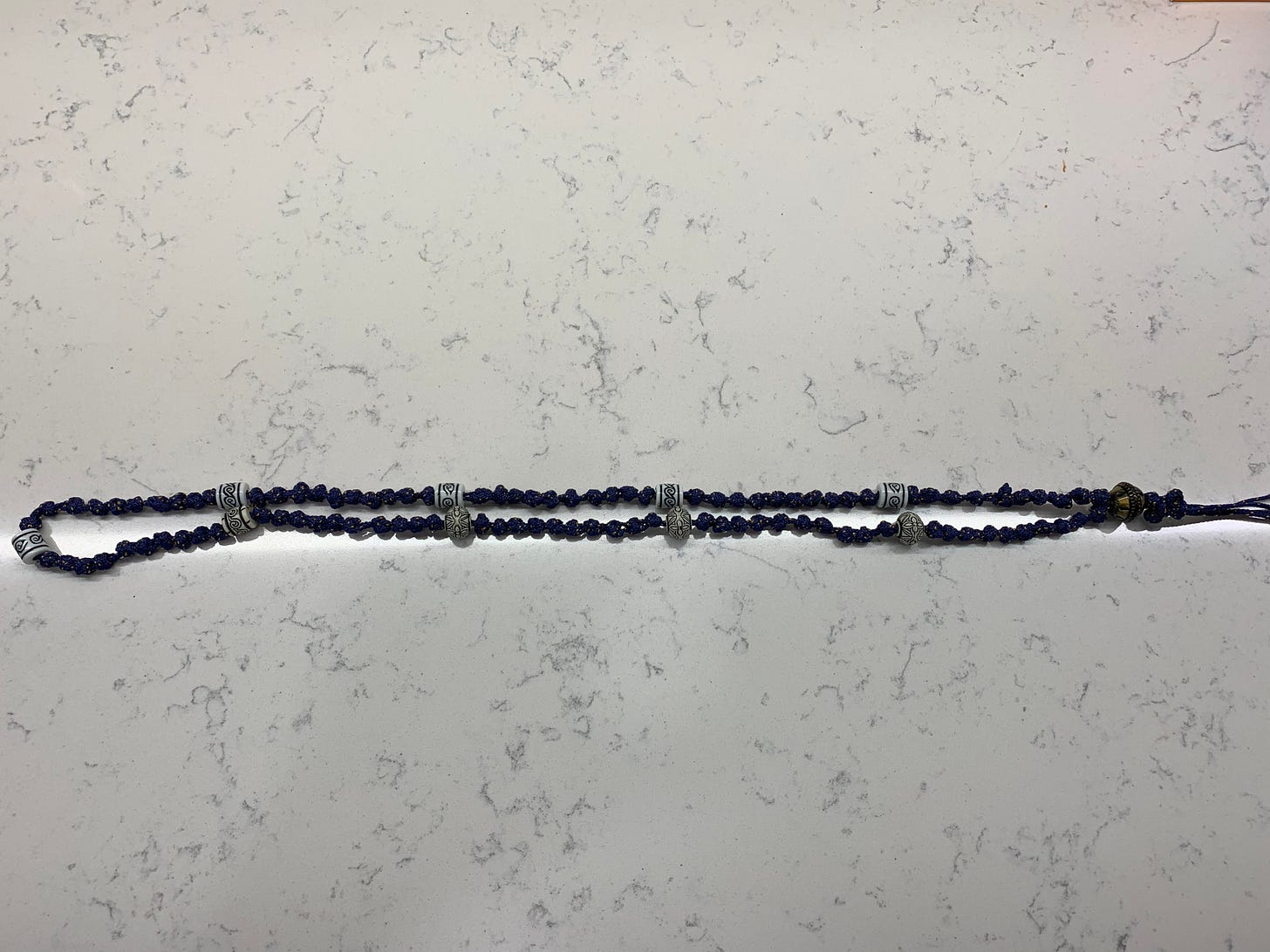 Slipping his phone back into his pocket, he pulled out the long looped cord of knots. Even just the feel of it in his pocket made him happy. There was a period when he felt awkward carrying it around all the time like a talisman. That was many months and months ago. He didn’t even care when people saw him with it draped over his hand as he walked around. It took months to tie each of the 100 knots. 10 knots then a bead. All the way round, 100 knots and 10 mismatched beads. Maybe he should have bought matching beads. Too late. By the time he realized that 30 knots and three beads seemed too short, he had used up his three matching beads. After all that work, he was not going restart the cord or untie the knots and start over. Now it just seemed a mirror of himself. Misshapen knots and mismatching beads. A metaphor of his spiritual life?