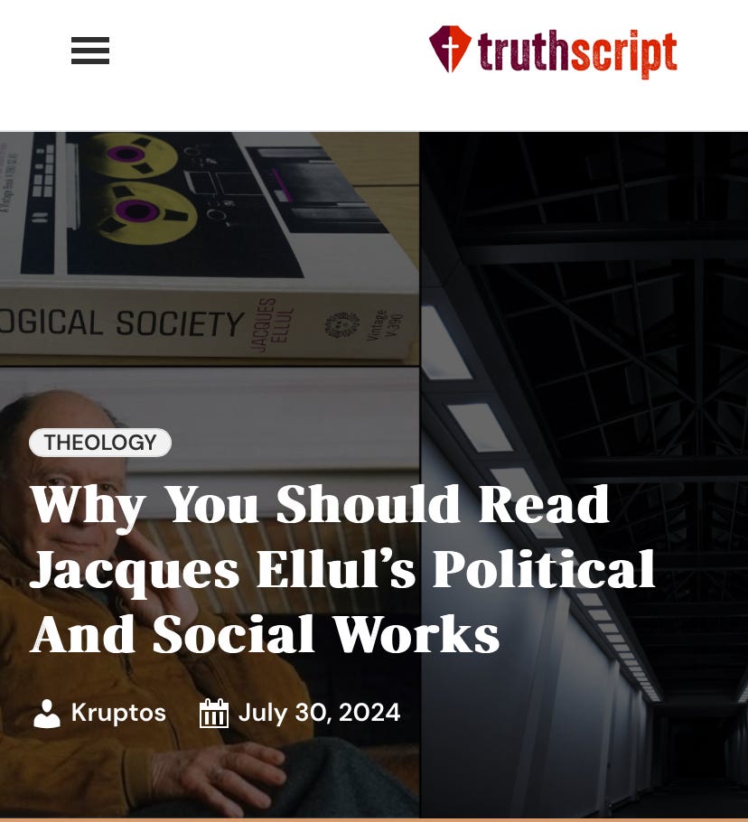 I was recently doing some updating here — adding links to the spoken version of my pieces right into the articles themselves…making it easier to find the audio for those who prefer to listen — and was reminded that its been a while since I wrote my introductions to Ellul’s thinking. Even some of the “deep dives” go back a while. If you are new here and are thinking that a quick overview of some of Ellul’s major political and sociological writings might be helpful, I was asked by TruthScript to write up an introduction to Ellul for their readers. Click the pic for the link.