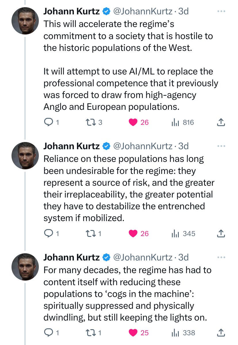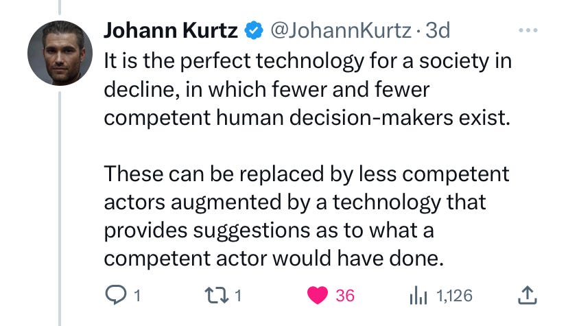 With the advent of AI technologies, the real possibility exists for a whole host of tasks and processes, those formerly in the possession of professionals of various kinds, that will now be abstracted, systematized, and turned into digital assistants for the few remaining people with real intellectual value. As Kurtz argues, contra the assertion of Andreesen, the regime has always coveted the idea of being able to replace workers with machines. Machines are powerful. They are run tirelessly 24/7, and they are not politically risky.